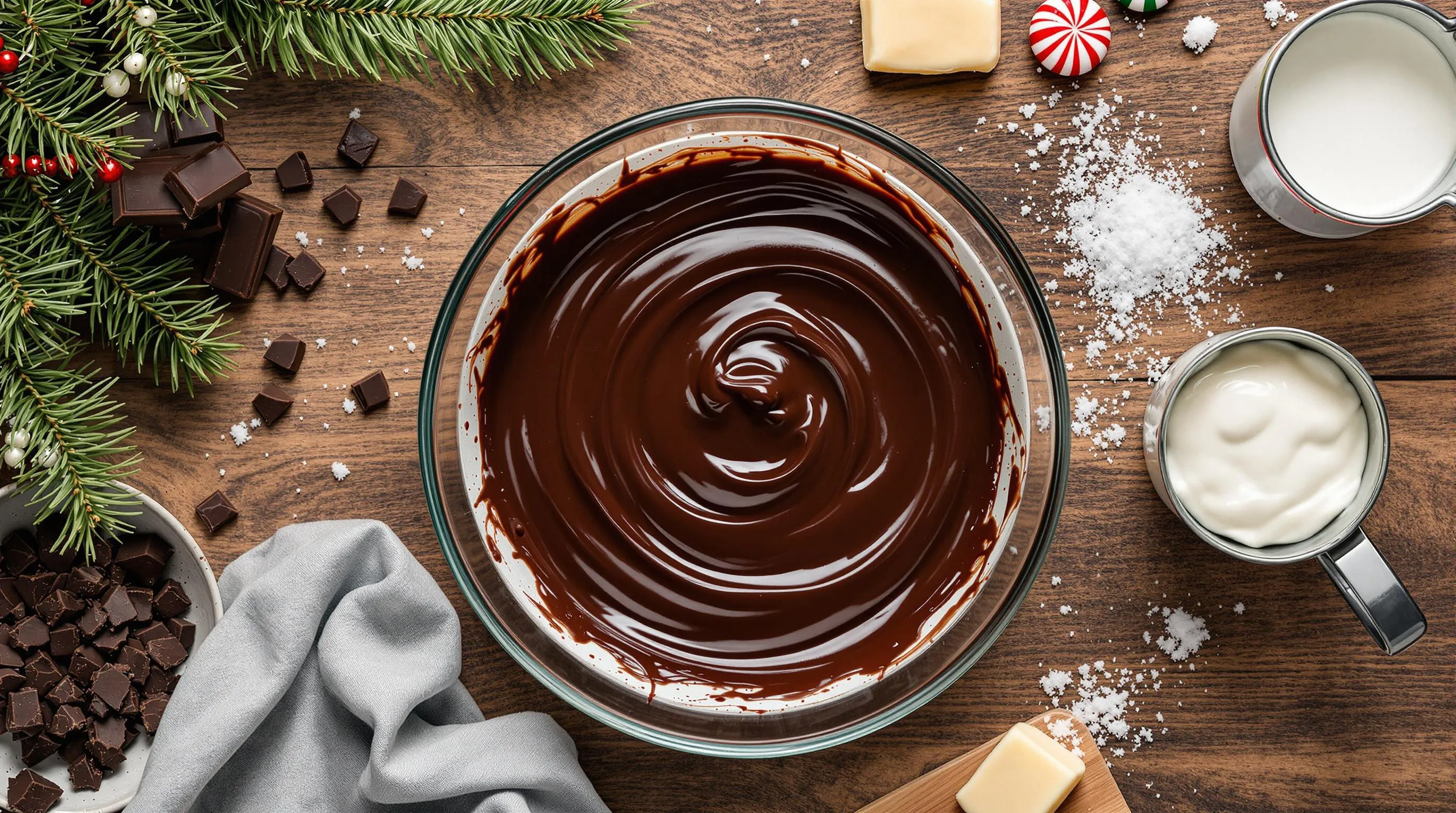 The chocolate ganache forms the rich glossy topping that elevates your peppermint roll cake to showstopping status. You’ll need just a few high-quality ingredients to create this decadent finishing touch: