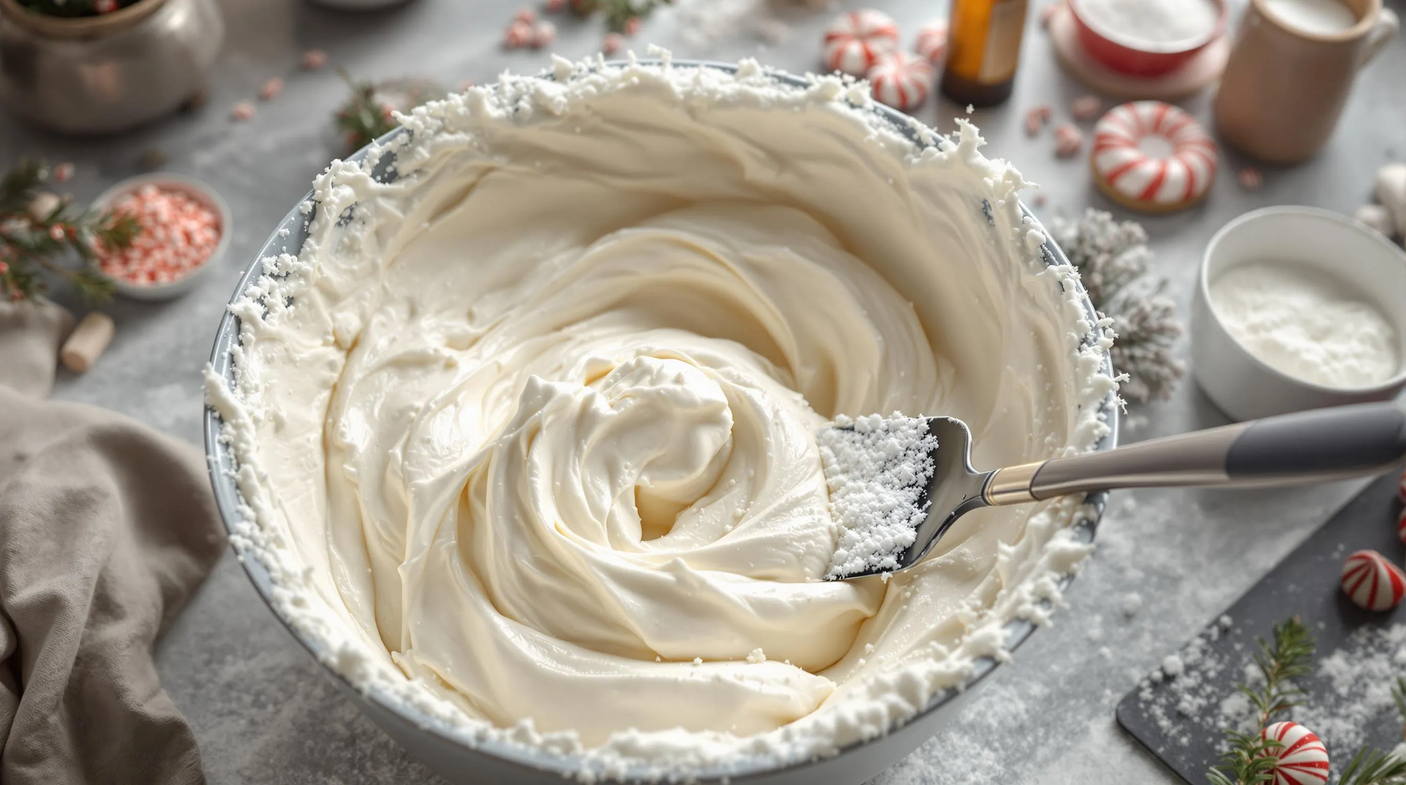 Add the powdered sugar to the cream cheese and mix until fully incorporated. The mixture should be smooth but still thick at this point. Stir in the peppermint extract and a pinch of salt ensuring the extract is evenly distributed throughout the cream cheese base.