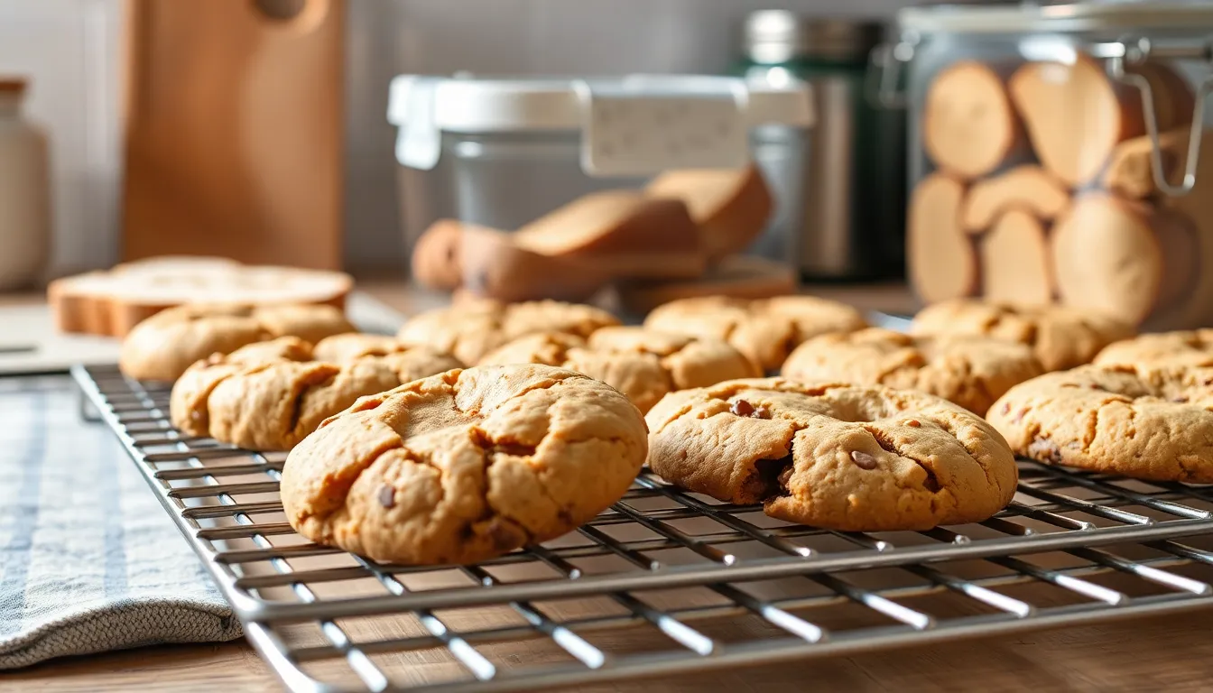Cooling racks allow proper air circulation around freshly baked cookies preventing soggy bottoms while maintaining optimal texture. Wire racks with tight spacing work best for supporting large cookies without sagging.