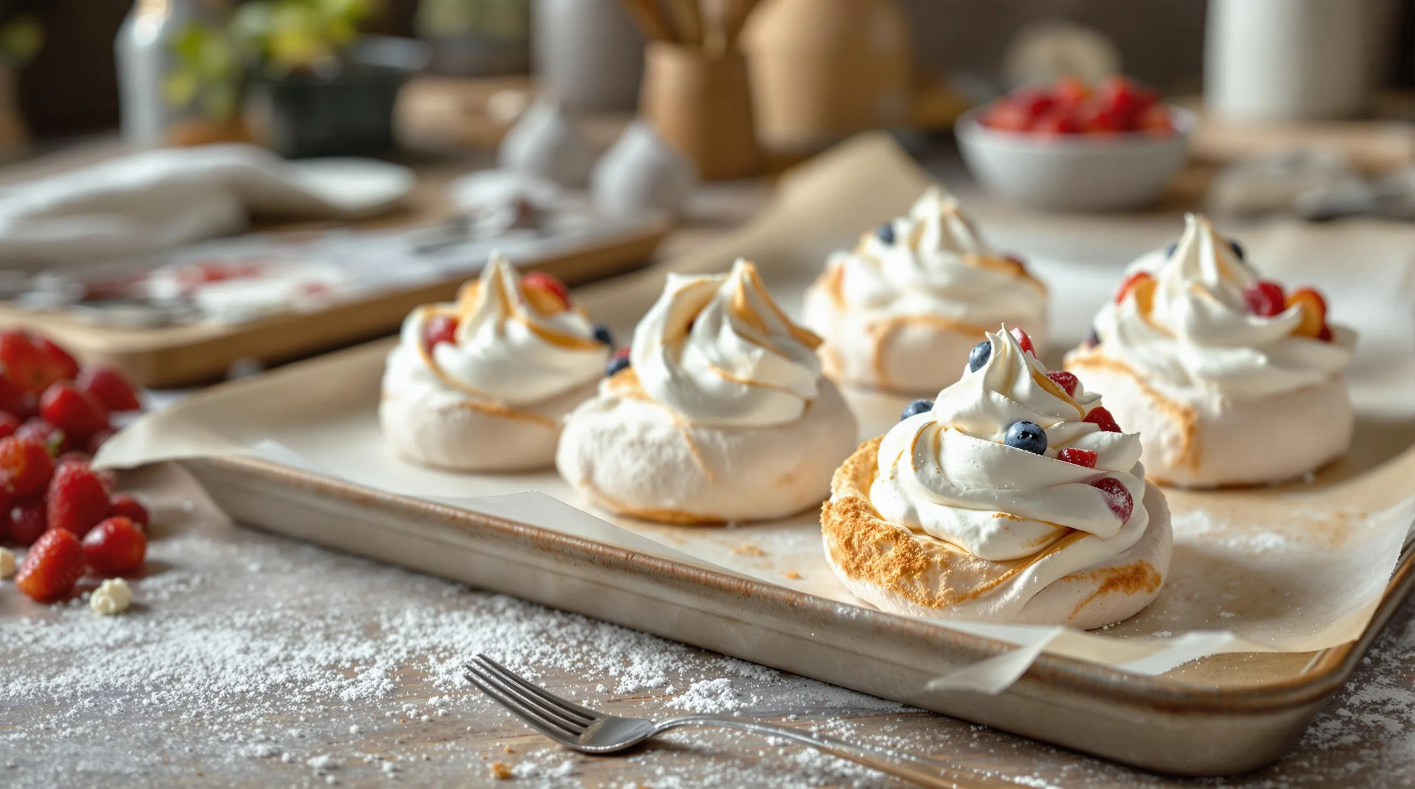 Your workspace should allow enough room to pipe or spoon multiple mini pavlovas onto the baking sheets with adequate spacing between each one. Having all equipment ready before beginning will streamline the process and help maintain the integrity of your whipped egg whites, which can begin to deflate if left waiting too long.