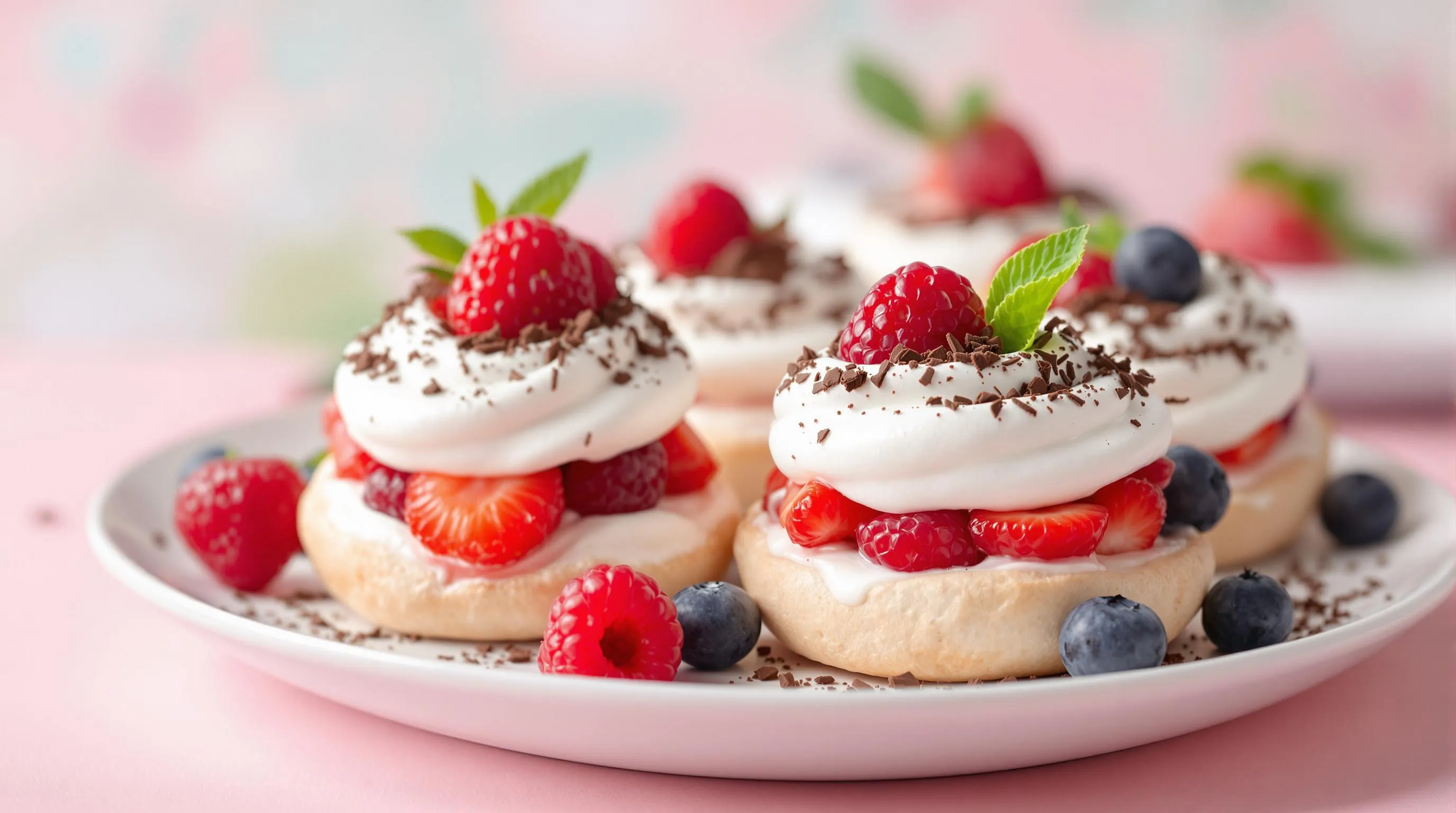 Mini pavlovas are individual-sized versions of the classic pavlova dessert featuring crisp meringue shells with soft marshmallow centers. These delicate treats serve as the perfect canvas for fresh toppings like whipped cream and seasonal fruits.