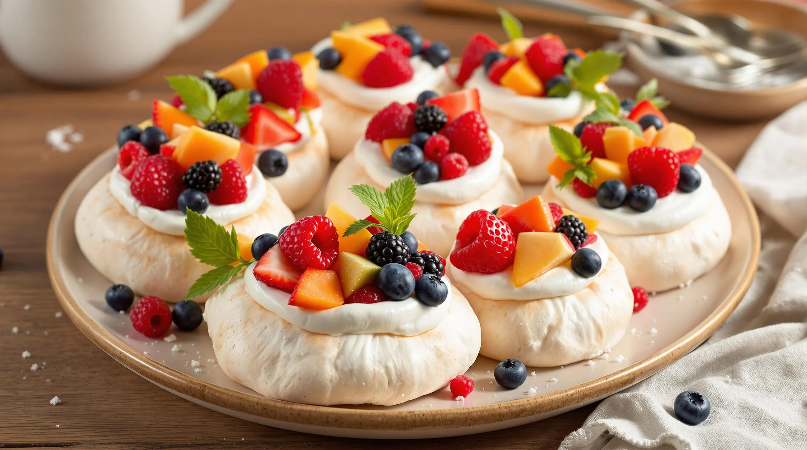 Fresh fruit adds vibrant color, natural sweetness, and refreshing acidity that perfectly balances the sweet meringue and rich cream. Berries work exceptionally well—strawberries, raspberries, blueberries, and blackberries offer both visual appeal and bright flavor notes. Tropical fruits like mango, passion fruit, and kiwi provide exotic flair and striking color contrast against the white pavlova base. Stone fruits including peaches, nectarines, and cherries deliver juicy sweetness when in season. Consider creating visual impact by arranging fruits in patterns or color gradients across your mini pavlovas. Macerated fruits can elevate your presentation—simply toss sliced fruits with a teaspoon of sugar and let them sit for 15-20 minutes to release their juices and intensify flavors. For special occasions, garnish with edible flowers or mint leaves that add a professional finishing touch. Remember that fruits should be added just before serving to prevent sogginess and maintain the crisp exterior of your perfectly crafted meringues.