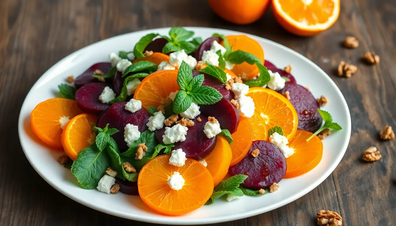 My Mediterranean twist brings bold flavors from the sunny coastlines to this earthy salad. I substitute feta cheese for goat cheese and add kalamata olives for a briny kick that pairs beautifully with the sweet oranges. Fresh oregano replaces the mint leaves while a handful of cucumber adds refreshing crunch. I drizzle extra virgin olive oil generously and finish with a sprinkle of za’atar seasoning. This version works exceptionally well with grilled lamb or Mediterranean-style chicken.