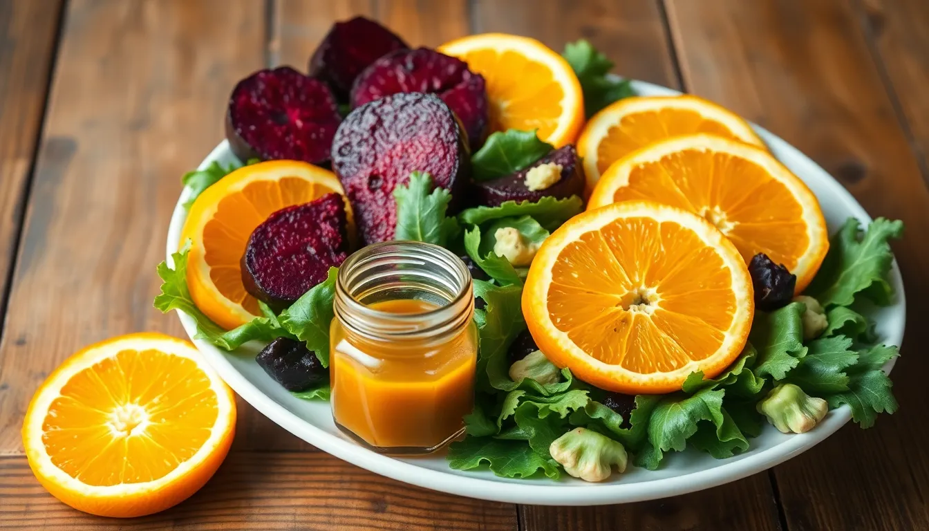 I arrange the mixed baby greens on my serving platter as the foundation then artfully place the sliced beets and orange segments on top. Thinly sliced red onion gets scattered over the salad followed by crumbled goat cheese and toasted walnuts. I drizzle the dressing evenly over the entire salad then finish with fresh mint leaves torn by hand for the best flavor release. The salad gets served immediately while the ingredients maintain their distinct textures and the dressing hasn’t wilted the greens.