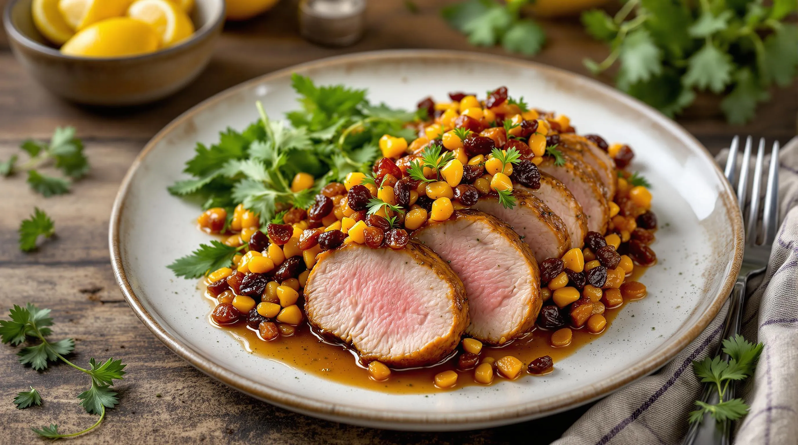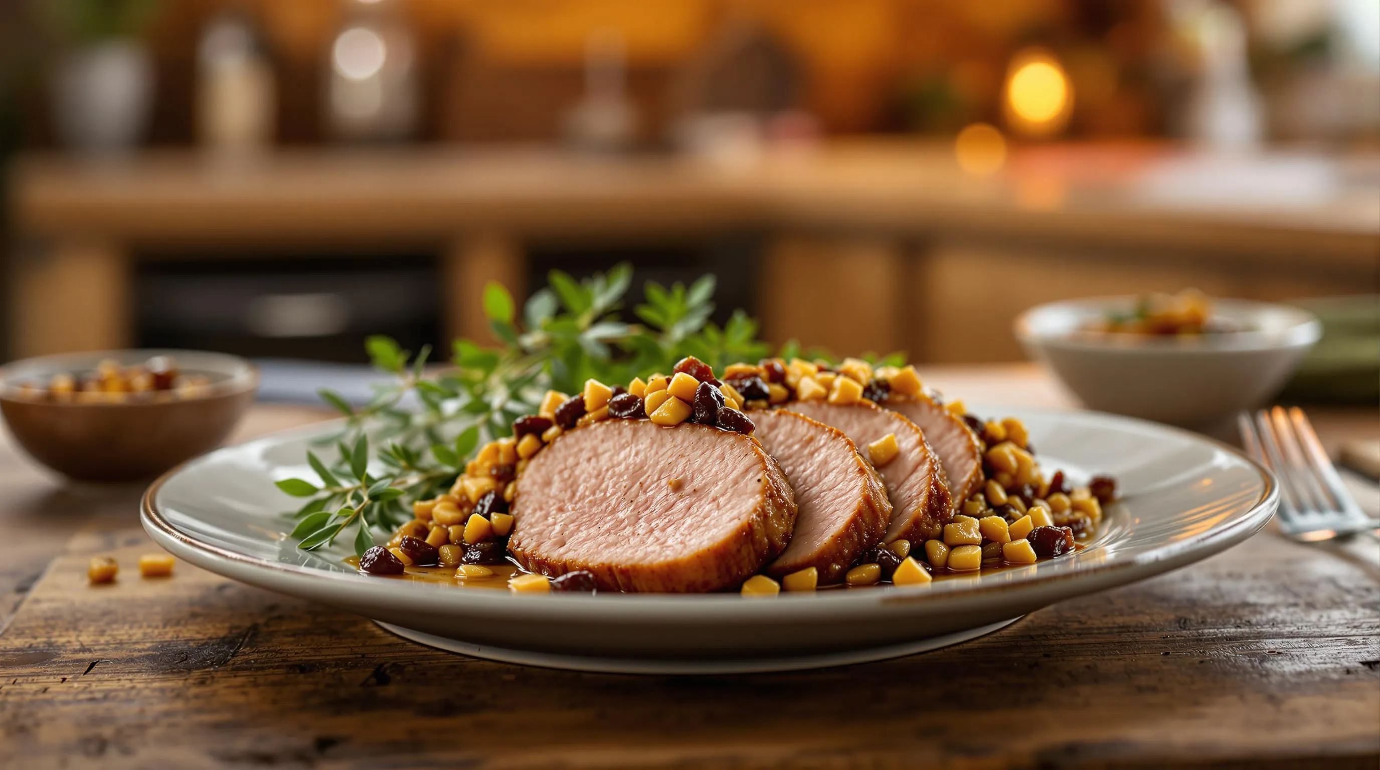 After searing, transfer the entire ovenproof skillet directly into the preheated oven. Roast the tenderloin for approximately 15 minutes, or until a meat thermometer registers 145°F when inserted into the thickest part of the meat. Remove the pork from the oven and transfer it to a cutting board. Allow the meat to rest for 10 minutes before slicing – this critical resting period allows the juices to redistribute throughout the meat, ensuring each slice remains moist and tender. While the pork rests, finish preparing your relish by combining all ingredients in a small bowl. Slice the tenderloin into thin medallions against the grain, arrange on plates, and top generously with the raisin pine nut relish for a beautiful presentation.