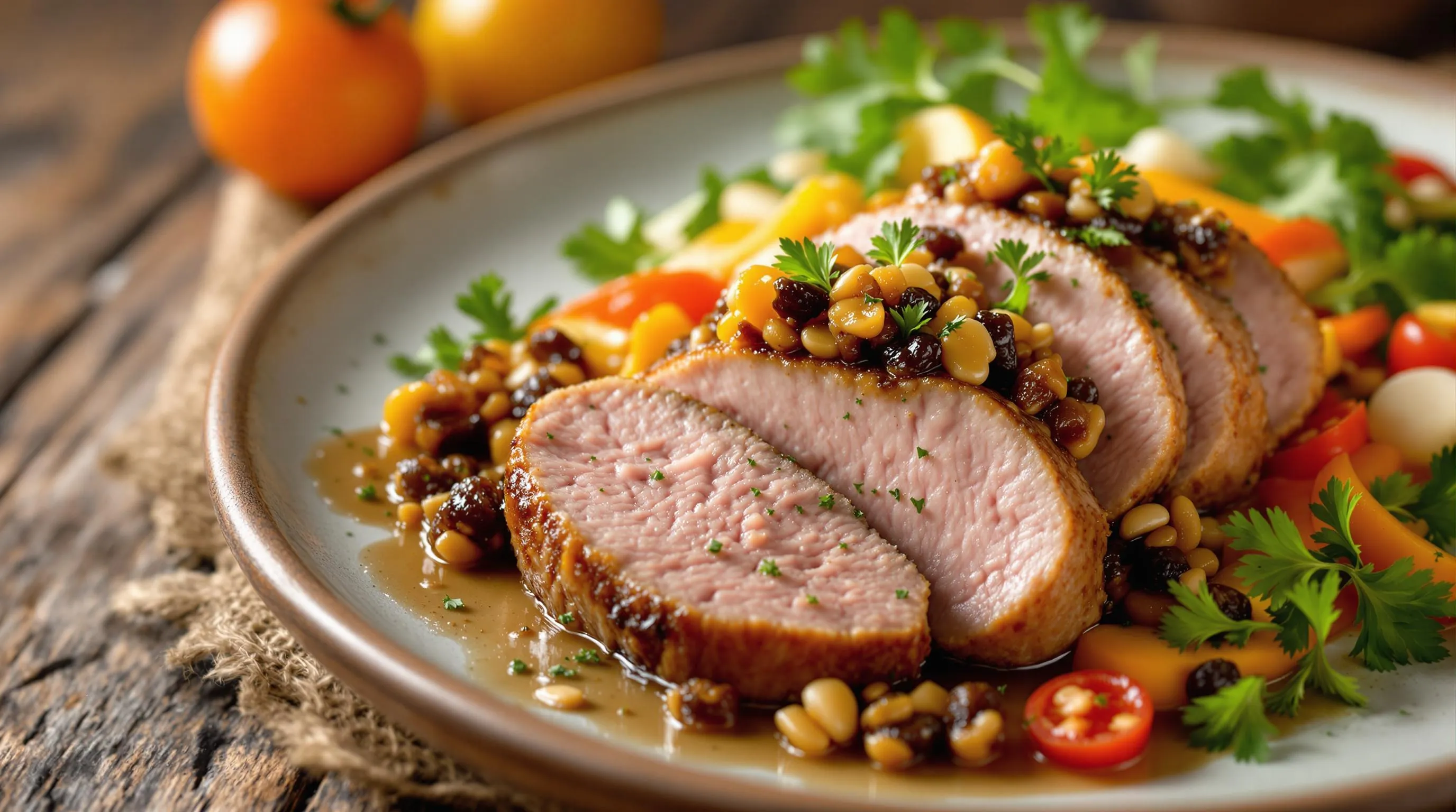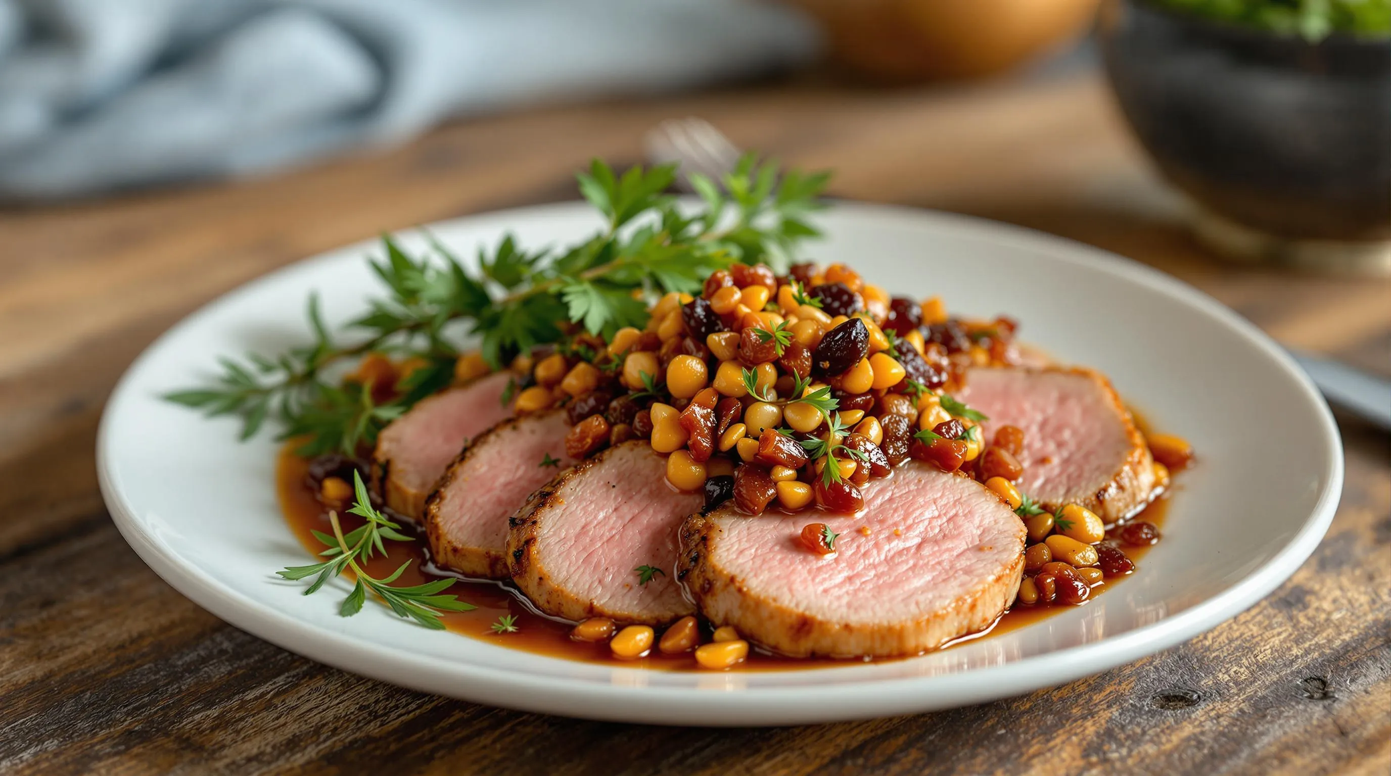 Slice the rested pork tenderloin into thin medallions. Arrange the slices on serving plates and top generously with the raisin pine nut relish. Serve immediately for the best flavor experience.