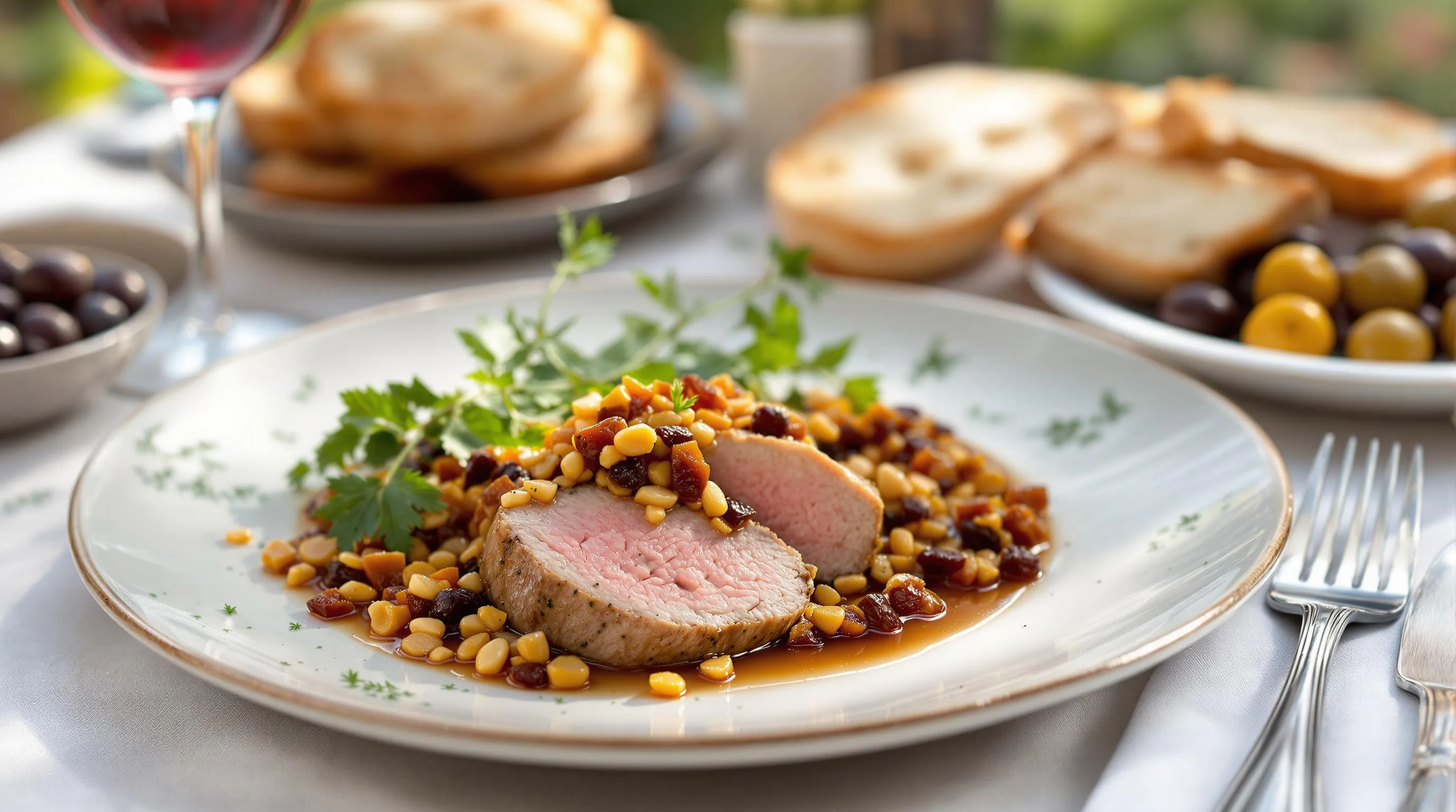 For a complete dinner party menu, start with a light appetizer like marinated olives or a simple crostini. This prevents guests from filling up before experiencing your magnificent pork tenderloin centerpiece with its jewel-like relish of golden raisins and pine nuts.